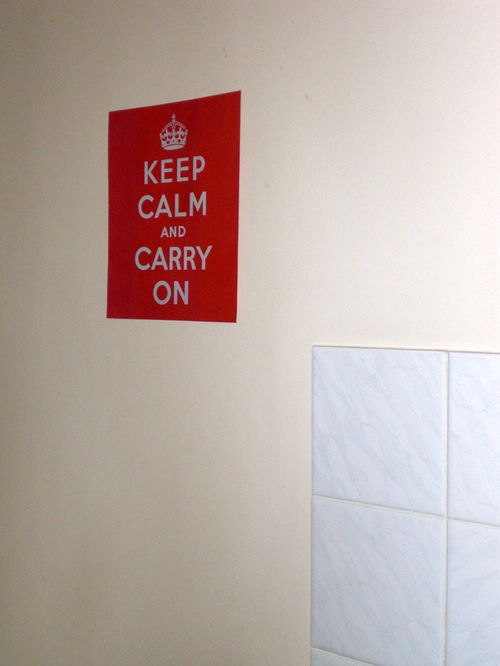 The Keep Calm poster came free in a newspaper and has been hanging around the flat since my visit last November. I found it in a desk drawer a few weeks ago and decided it would be a nice reminder as I walk up the steps and into the bedroom.